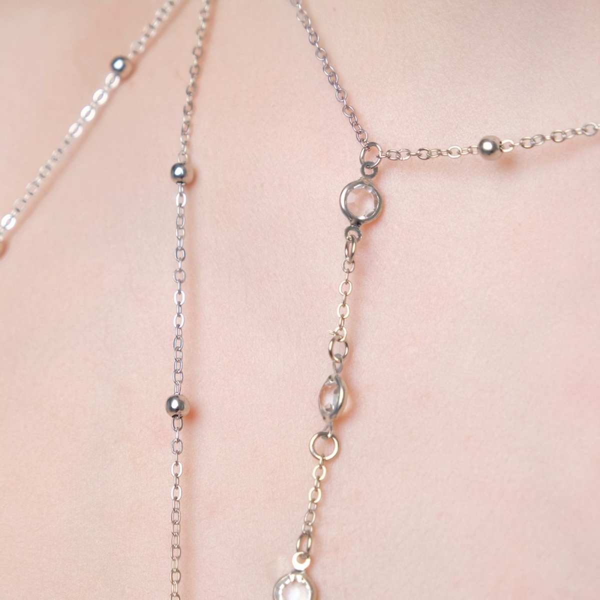 Украшение выполнено из металлических цепочек, оригинально расположенных между собой. Металлические бусинки чередуются с стразами и тонкими колечками на тонкой цепочки.