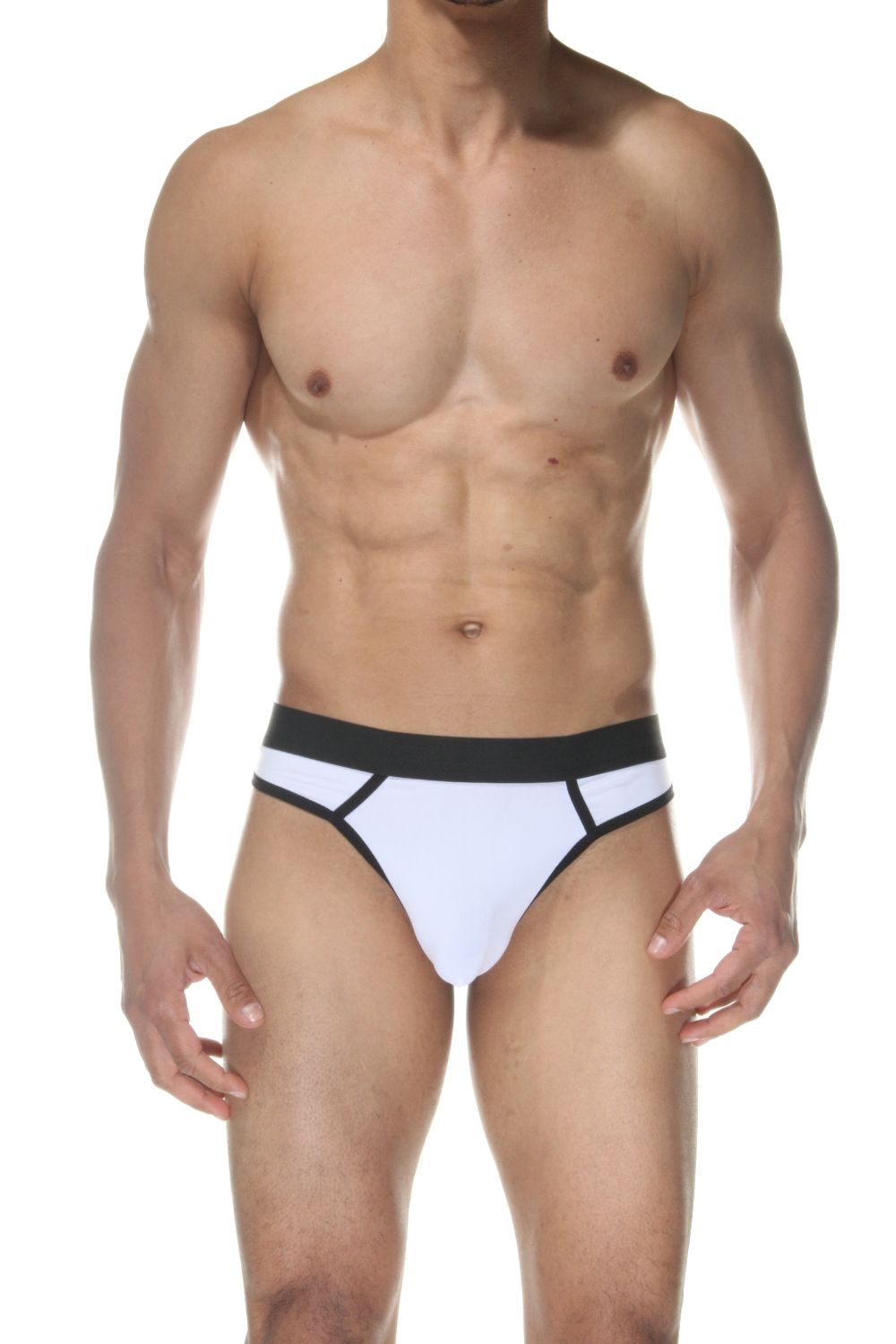 Белые мужские трусы-стринги.