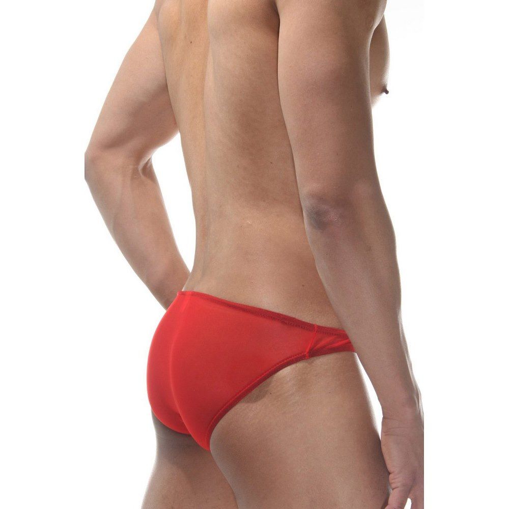 Красные мужские трусы-слипы из полупрозрачного материала.
