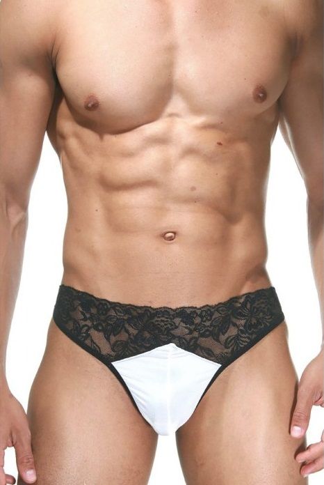 Танга для мужчин, с кружевным полотном на ягодицах и поясом, и белым, эластичным материалом в районе мошонки.