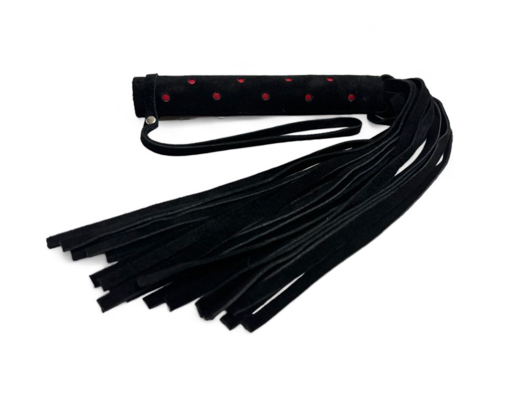 Плеть Red dot Princess - изящная модель, выполненная из натуральной качественной замши, которая очень приятна наощупь. Рукоятка плети имеет необычный дизайн и привлекает внимание. Количество хвостов - 23 штуки. Прекрасная плеть для Вашей любовной игры! Длина хвостов - 26 см.