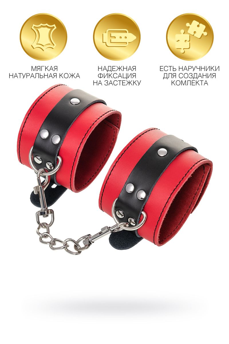 Оковы на ноги - волнующий воображение аксессуар, ведь это способ зафиксировать ноги партнера и получить полный доступ к его телу. Оковы из мягкой натуральной кожи сочетают в себе элементы, возбуждающие страсть и фантазию: красный и черный цвета и отделка металлическими элементами. В них будет комфортно подчиняться и ощущать ограничение свободы действий. Не натирают и имеют надежную степень фиксации. Размер легко регулируется металлической пряжкой. С помощью металлической цепочки и карабинов можно фиксировать ноги вместе, либо дополнить игру цепочкой и сковать ноги в широко разведенном положении. Длина манжет - 28 см., ширина - 6 см. Длина сцепки - 15,5 см.
