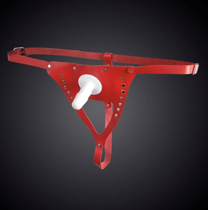 Трусики Харнесс. Изготовлены из натуральной кожи. При производстве используется никелированная фурнитура. Размер регулируется ремешками, которые крепятся на бёдрах (от 42 до 50 размера). В комплект входит съёмный пластиковый плаг для насадок. Идеально подходит для использования, как мужчиной, так и женщиной. Длина плага - 6,8 см.